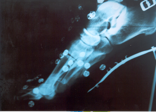 Cierre por planos. El paciente no pisa con el miembro operado por 8 dias. Alta a los 40 dias.